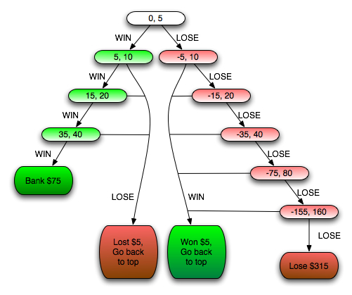 Prinzipiell beruht das Spiel darauf, dass man nach jedem Verlust auf eine 50 50 Wette (Schwarz oder Rot, Gerade oder Ungerade, 1-18 oder 19-36) seinen Einsatz verdoppelt. Sobald man gewonnen hat, streicht man einen Grundeinsatz gewinn ein und beginnt wieder von Neuem.